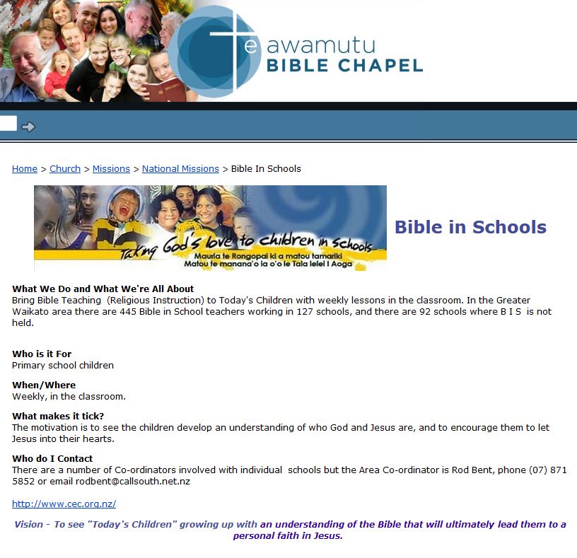 CEC affiliated volunteers are quite clear on what they are trying to achieve. (see attachments) The following quotes are from websites of the Te Awamutu Bible Chapel, the Eastgate Christian Centre and the Royal Oak Baptist Church. Two of these have been removed since the screen shots were taken in 2015.