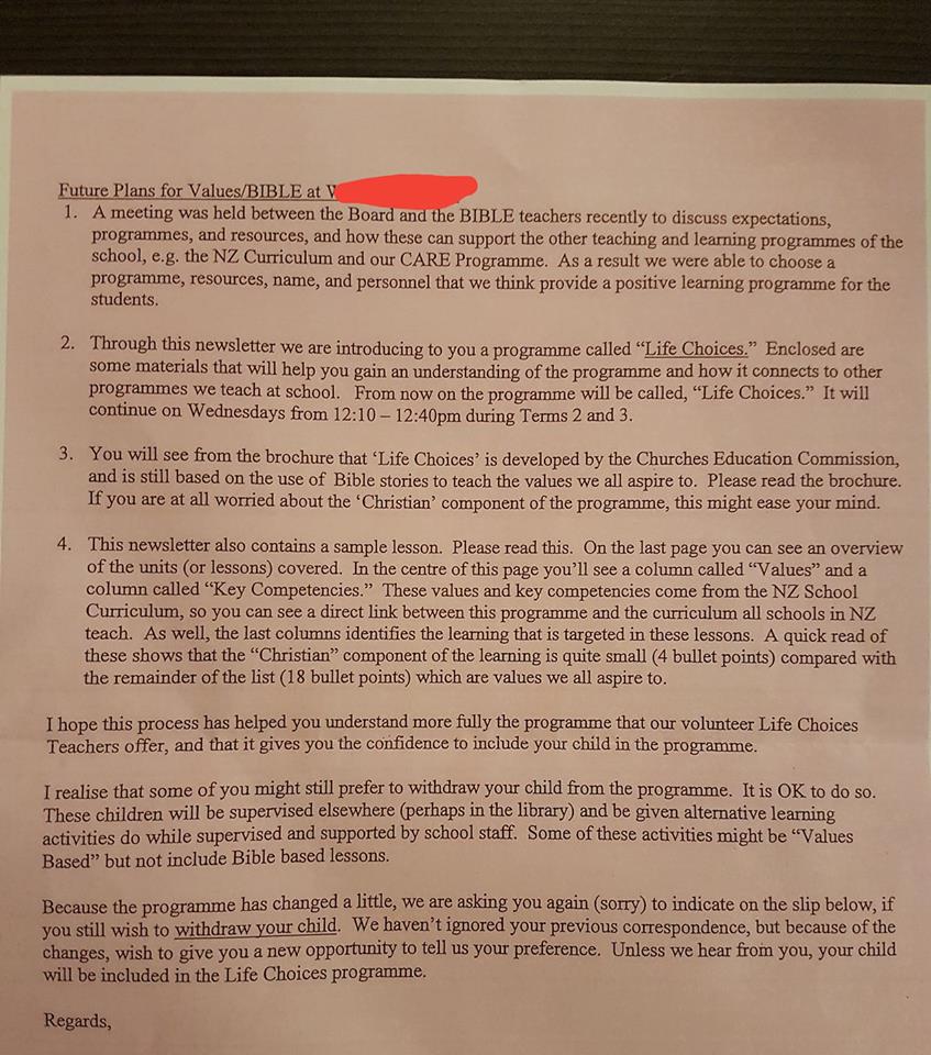 A parent with children at Wellsford School recently complained on the Secular Education Network facebook page about how the school had carried out a misleading survey asking about bible in schools. Despite the apparent bias for the classes, 33% of people surveyed were still opposed to them. Interestingly, the teachers were included in the survey. When the survey was sent out, promotional material from the Churches Education Commission (CEC), who provide the lessons was included. As you can see from the scan of the a letter from the school, they were not simply offering the CEC programme but actively endorsing it. There was nothing provided that offered an opposing view. Parents were also asked if they wanted to opt-out of the lessons regardless of the result. A little presumptuous perhaps!