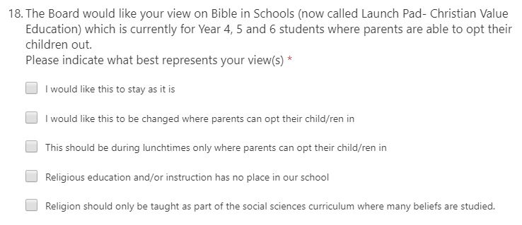 Update 6th September 2019 – Opaheke School sent out a link to a School Survey in a newsletter on 28th August 2019 that included a question about religious instruction. The question is below. It’s great that they are giving parents the opportunity to tell them what they think. My concern is that the survey would be used to justify the continuation of the classes if there is a majority vote in favour of religious instruction. If so, this would be an abdication of the responsibilities of the board to ensure that the school is inclusive and welcoming to all families. A majority vote does not justify the promotion of any religious views and the inherent discrimination against the minority.